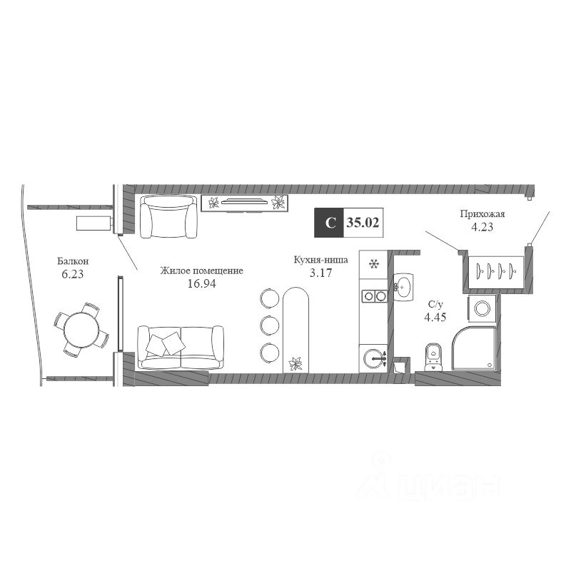 Общая площадь35,02 м²