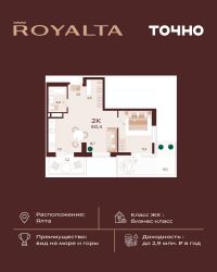 Жилой комплекс "РОЯЛТА" включает 5 монолитно-кирпичных девятиэтажных зданий. Проект предлагает квартиры различных планировок: от однокомнатных до трехкомнатных с расширенными балконами и террасами до 13,4 м2. Территория будет благоустроена детскими игровыми и спортивными площадками, гостевой автостоянкой и озеленением, включая газоны, деревья и кустарники. Также появятся современные уличные тренажёры, СПА-комплекс и панорамный инфинити-бассейн. В шаговой доступности находятся центральная набережная Ялты, детские сады, школы, супермаркеты, торговые центры, Ялтинский медицинский колледж, автовокзал и Мордвиновский парк.