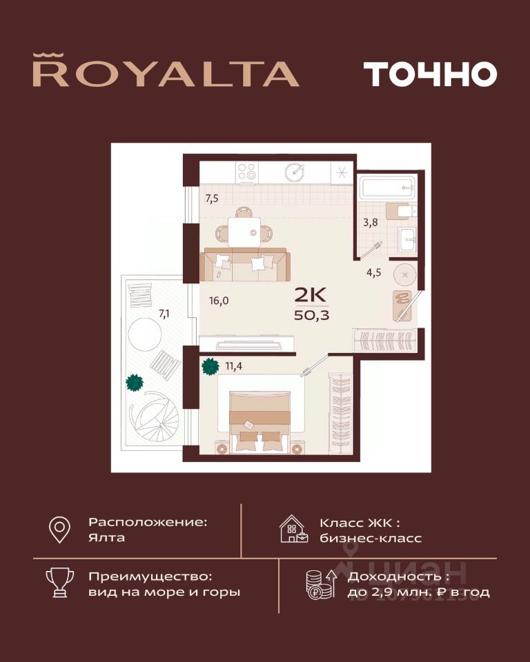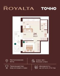 Жилой комплекс "РОЯЛТА" включает 5 монолитно-кирпичных девятиэтажных зданий. Проект предлагает квартиры различных планировок: от однокомнатных до трехкомнатных с расширенными балконами и террасами до 13,4 м2. Территория будет благоустроена детскими игровыми и спортивными площадками, гостевой автостоянкой и озеленением, включая газоны, деревья и кустарники. Также появятся современные уличные тренажёры, СПА-комплекс и панорамный инфинити-бассейн. В шаговой доступности находятся центральная набережная Ялты, детские сады, школы, супермаркеты, торговые центры, Ялтинский медицинский колледж, автовокзал и Мордвиновский парк.