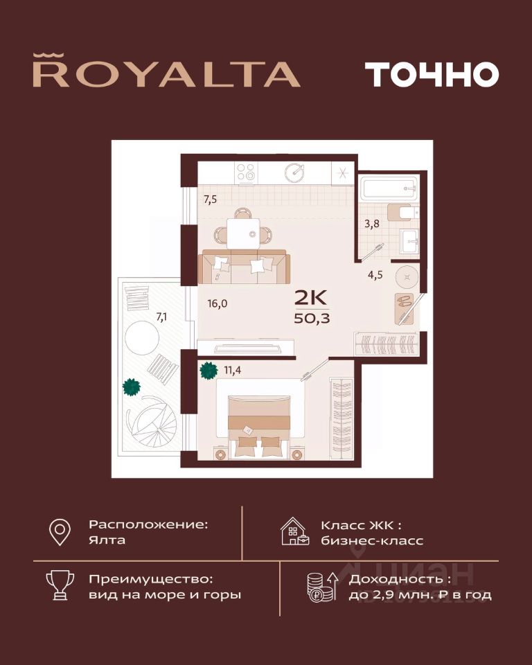 Жилой комплекс "РОЯЛТА" включает 5 монолитно-кирпичных девятиэтажных зданий. Проект предлагает квартиры различных планировок: от однокомнатных до трехкомнатных с расширенными балконами и террасами до 13,4 м2. Территория будет благоустроена детскими игровыми и спортивными площадками, гостевой автостоянкой и озеленением, включая газоны, деревья и кустарники. Также появятся современные уличные тренажёры, СПА-комплекс и панорамный инфинити-бассейн. В шаговой доступности находятся центральная набережная Ялты, детские сады, школы, супермаркеты, торговые центры, Ялтинский медицинский колледж, автовокзал и Мордвиновский парк.