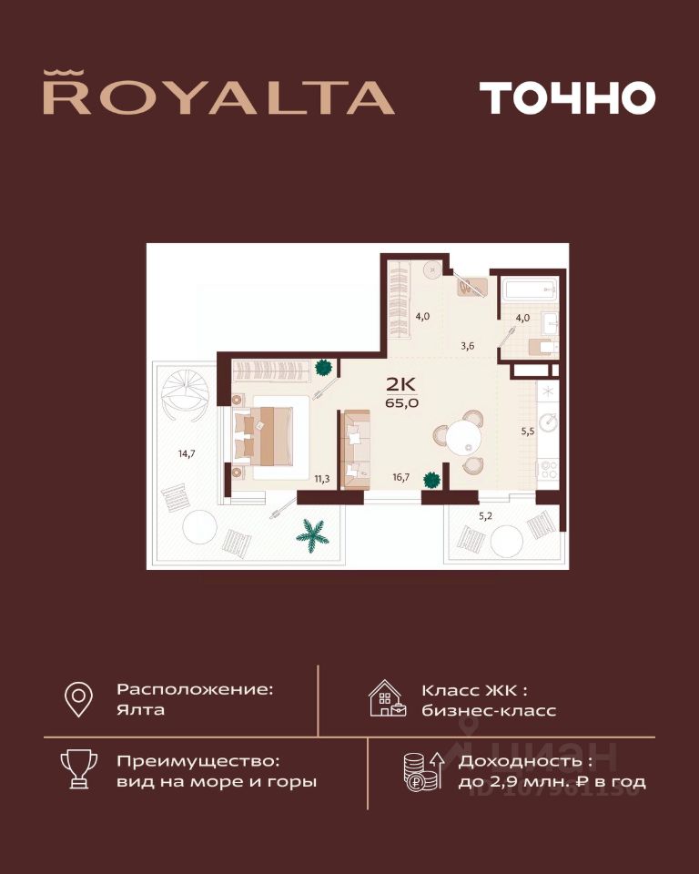 Жилой комплекс "РОЯЛТА" включает 5 монолитно-кирпичных девятиэтажных зданий. Проект предлагает квартиры различных планировок: от однокомнатных до трехкомнатных с расширенными балконами и террасами до 13,4 м2. Территория будет благоустроена детскими игровыми и спортивными площадками, гостевой автостоянкой и озеленением, включая газоны, деревья и кустарники. Также появятся современные уличные тренажёры, СПА-комплекс и панорамный инфинити-бассейн. В шаговой доступности находятся центральная набережная Ялты, детские сады, школы, супермаркеты, торговые центры, Ялтинский медицинский колледж, автовокзал и Мордвиновский парк.