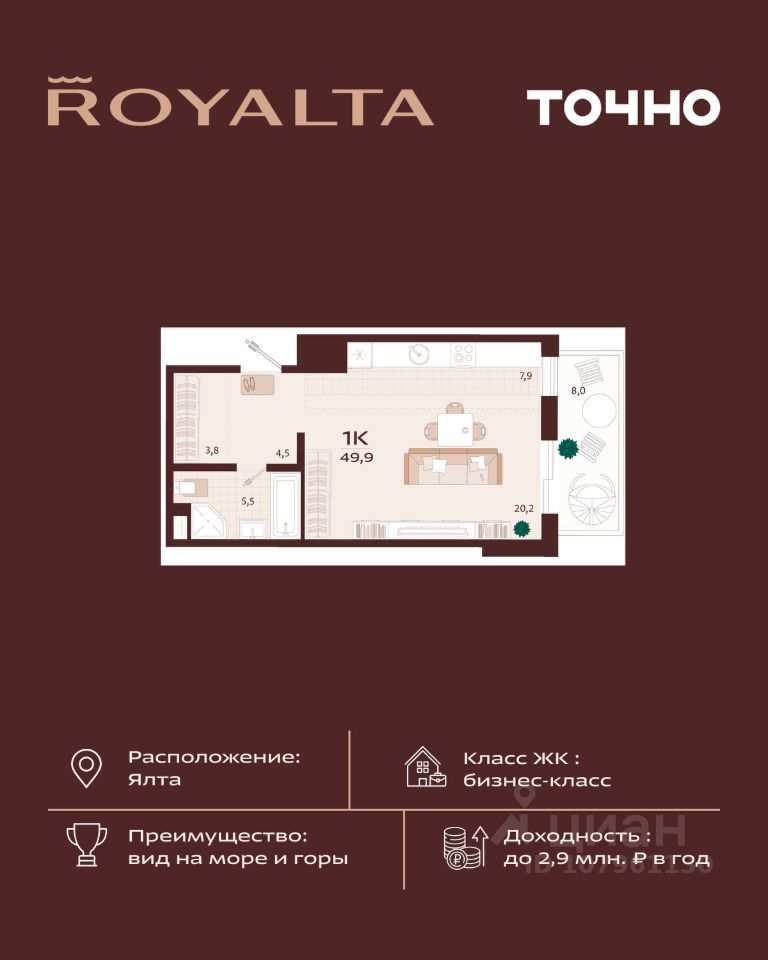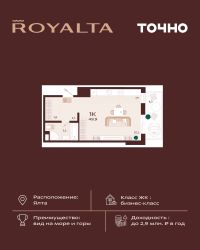 Жилой комплекс "РОЯЛТА" включает 5 монолитно-кирпичных девятиэтажных зданий. Проект предлагает квартиры различных планировок: от однокомнатных до трехкомнатных с расширенными балконами и террасами до 13,4 м2. Территория будет благоустроена детскими игровыми и спортивными площадками, гостевой автостоянкой и озеленением, включая газоны, деревья и кустарники. Также появятся современные уличные тренажёры, СПА-комплекс и панорамный инфинити-бассейн. В шаговой доступности находятся центральная набережная Ялты, детские сады, школы, супермаркеты, торговые центры, Ялтинский медицинский колледж, автовокзал и Мордвиновский парк.
