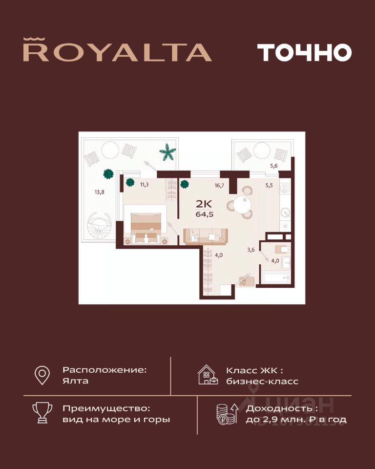 Жилой комплекс "РОЯЛТА" включает 5 монолитно-кирпичных девятиэтажных зданий. Проект предлагает квартиры различных планировок: от однокомнатных до трехкомнатных с расширенными балконами и террасами до 13,4 м2. Территория будет благоустроена детскими игровыми и спортивными площадками, гостевой автостоянкой и озеленением, включая газоны, деревья и кустарники. Также появятся современные уличные тренажёры, СПА-комплекс и панорамный инфинити-бассейн. В шаговой доступности находятся центральная набережная Ялты, детские сады, школы, супермаркеты, торговые центры, Ялтинский медицинский колледж, автовокзал и Мордвиновский парк.