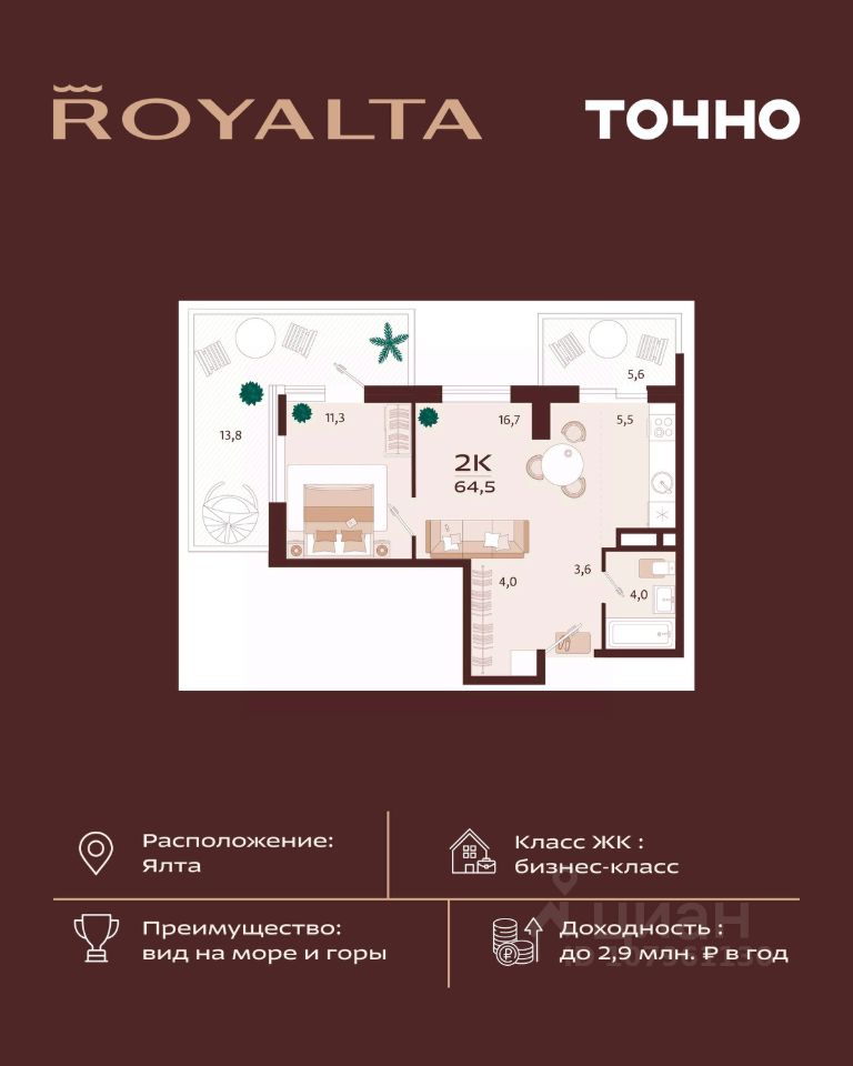 Жилой комплекс "РОЯЛТА" включает 5 монолитно-кирпичных девятиэтажных зданий. Проект предлагает квартиры различных планировок: от однокомнатных до трехкомнатных с расширенными балконами и террасами до 13,4 м2. Территория будет благоустроена детскими игровыми и спортивными площадками, гостевой автостоянкой и озеленением, включая газоны, деревья и кустарники. Также появятся современные уличные тренажёры, СПА-комплекс и панорамный инфинити-бассейн. В шаговой доступности находятся центральная набережная Ялты, детские сады, школы, супермаркеты, торговые центры, Ялтинский медицинский колледж, автовокзал и Мордвиновский парк.
