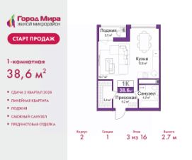 Просторная однокомнатная квартира с предчистовой отделкой в ЖМ "Город Мира" на 3 этаже. Общая площадь: 38.6 кв.м., жилая: 10.7 кв.м., площадь просторной кухни-столовой: 12.8 кв.м. Все окна выходят на одну сторону. В квартире одна лоджия, один совмещенный санузел. Высота потолков 2.7 м.