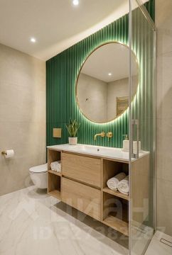 Современный санузел, отделанный дорогими материалами с качественной сантехникой.