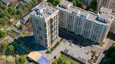 Монолитно-каркасный 16-этажный дом выполнен в современном стиле. Фасад из керамогранита светлых тонов с витражными системами остекления подчеркивает непринуждённый и гармоничный внешний вид здания.