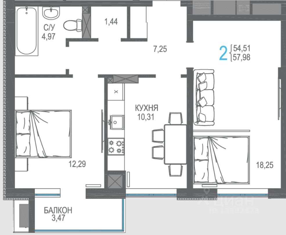 Продаётся 2-комнатная квартира в сданном доме (Дом 1), срок сдачи: IV-кв. 2024, общей площадью 58.34 кв.м., на 8 этаже. Жилой комплекс от застройщика "Интерстрой" в п.г.т. Гвардейское Симферопольского района на улице Курганная.