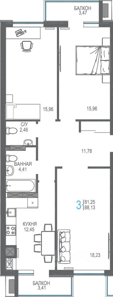 Продаётся 3-комнатная квартира в строящемся доме (Дом 3), срок сдачи: III-кв. 2026, общей площадью 88.59 кв.м., на 7 этаже. Жилой комплекс от застройщика "Интерстрой" в п.г.т. Гвардейское Симферопольского района на улице Курганная.