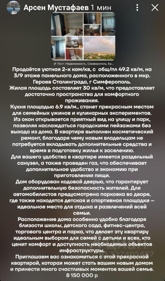 Продаётся уютная 2-х кам/кв, с общ/пл 49.2 кв/м, на 3/9 этаже панельного дома, расположенного в мкр. Героев Сталинграда, г Симферополь.