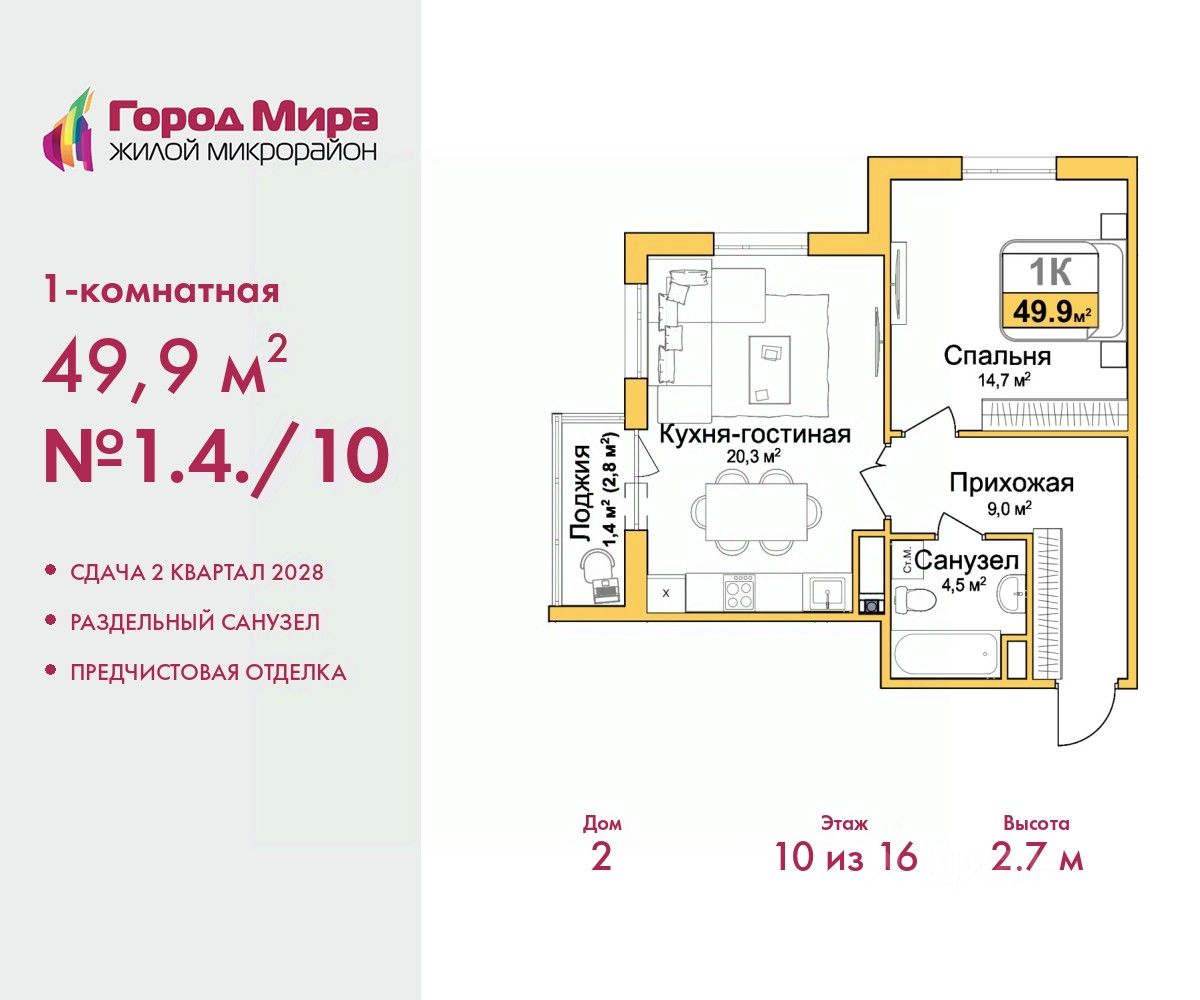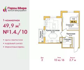 Просторная 1-комн. квартира с предчистовой отделкой в ЖМ "Город Мира" на 10 этаже. Общая площадь: 49.9 кв.м., жилая: 14.7 кв.м., площадь просторной кухни-столовой: 20.3 кв.м. Угловая квартира, идеально подойдет любителям тишины и панорамных видов. В квартире один балкон, один совмещенный санузел. Высота потолков 2.7 м.