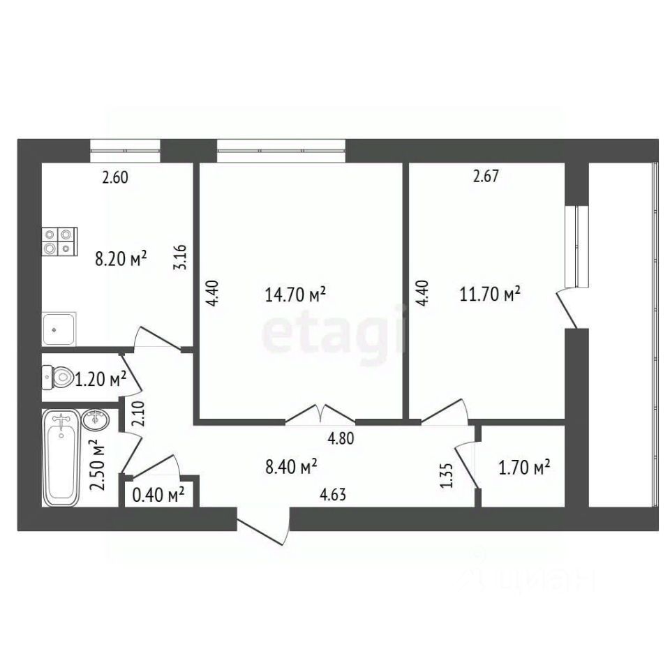 Общая площадь квартиры, без учета лоджии, 49 м2, кухня - 8 м2.