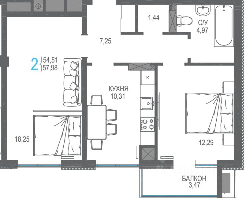 Продаётся 2-комнатная квартира в строящемся доме (Дом 2), срок сдачи: III-кв. 2026, общей площадью 58.34 кв.м., на 8 этаже. Жилой комплекс от застройщика "Интерстрой" в п.г.т. Гвардейское Симферопольского района на улице Курганная.