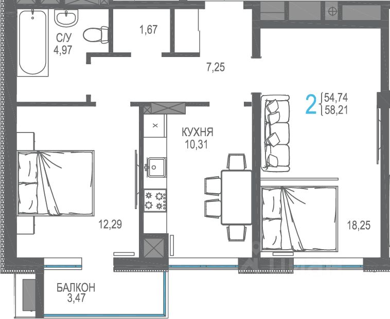 Продаётся 2-комнатная квартира в строящемся доме (Дом 3), срок сдачи: III-кв. 2026, общей площадью 57.49 кв.м., на 7 этаже. Жилой комплекс от застройщика "Интерстрой" в п.г.т. Гвардейское Симферопольского района на улице Курганная.