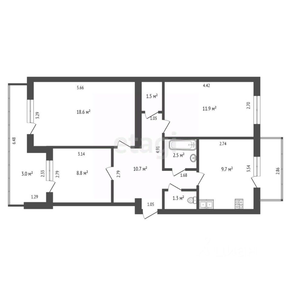 Комнаты: 3 светлые и уютные комнаты: 18.6 кв.м., 11.9 кв.м. и 8.8 кв.м., идеально подойдут для обустройства спальни, гостиной и детской.