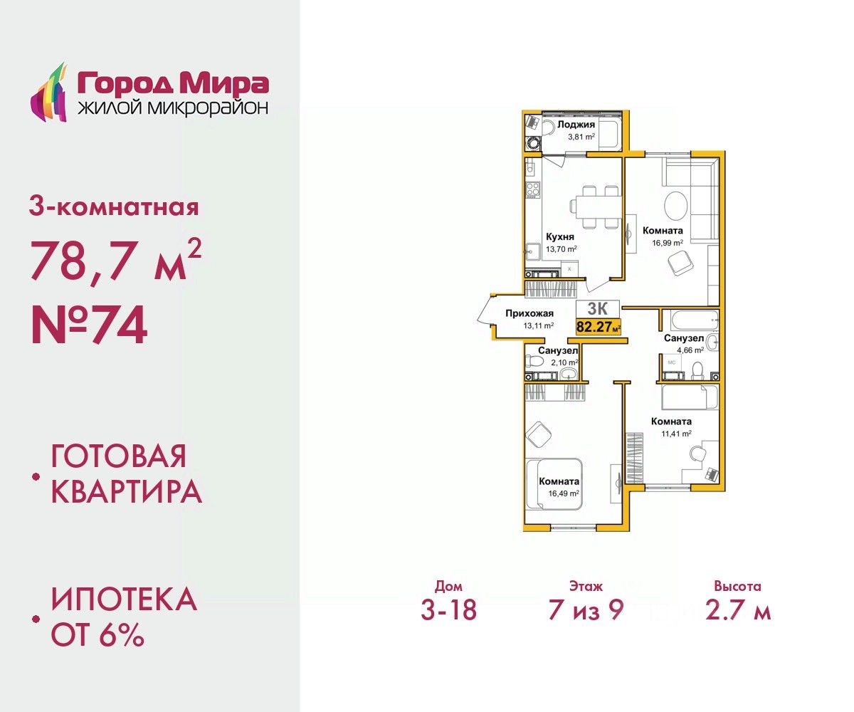 Продается 3-комн. квартира с предчистовой отделкой в ЖМ "Город Мира" на 7 этаже. Общая площадь: 78.7 кв.м., жилая: 29.89 кв.м., площадь просторной кухни-столовой: 13.7 кв.м. Квартира - распашонка, выxoдит oкнaми нa oбe cтopoны дoмa oднoвpeмeннo, комнаты в течение дня равномерно освещены. В квартире один балкон, один совмещенный и один раздельный санузел. Высота потолков 2.7 м.