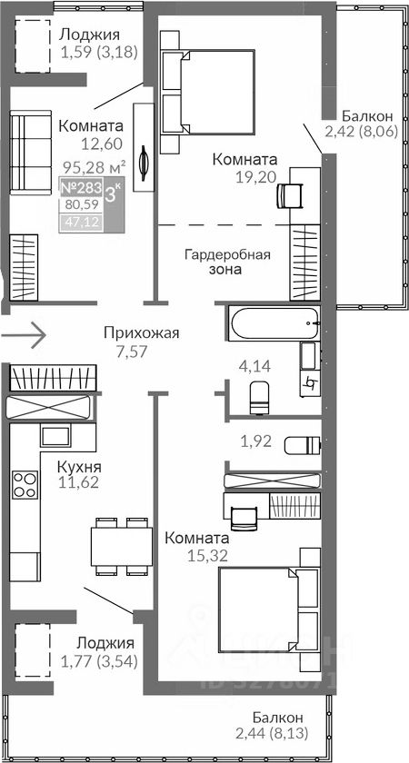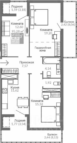 Общая площадь квартиры 95,28 кв.м.