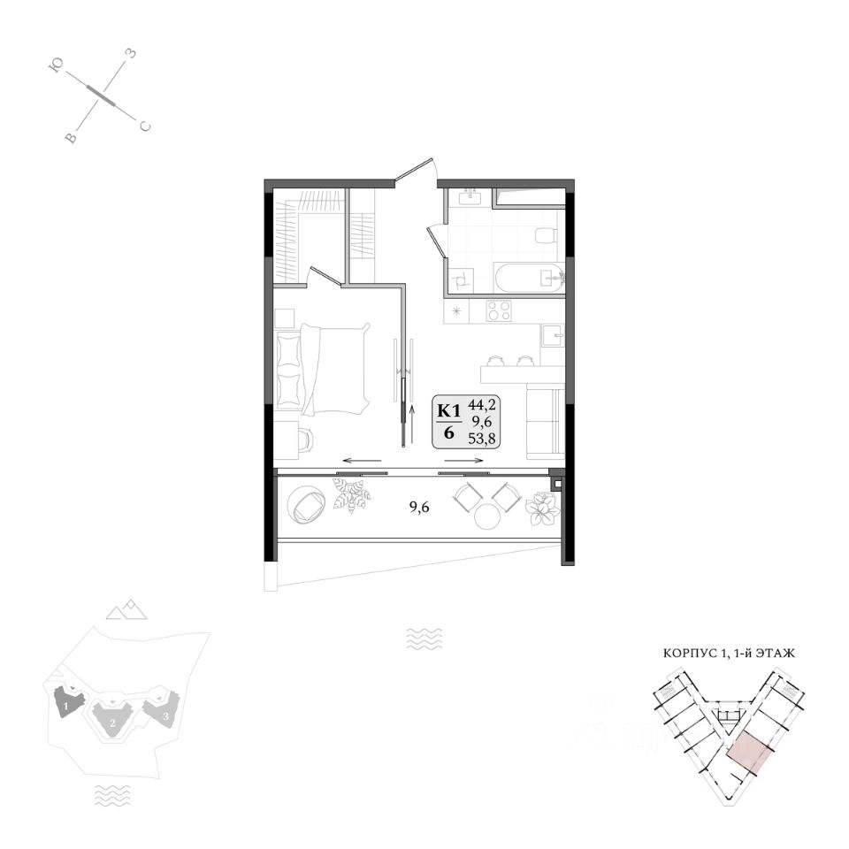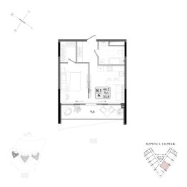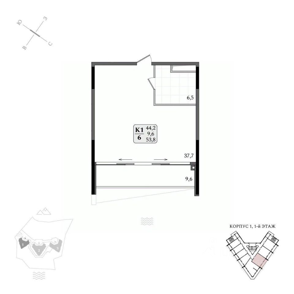 Продаётся студия-апартаменты в строящемся доме (Корпус 1), срок сдачи: IV-кв. 2027, общей площадью 53.8 кв.м., на 1 этаже.