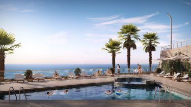 Взрослый и детский бассейны с местами для отдыха и видом на Черное море