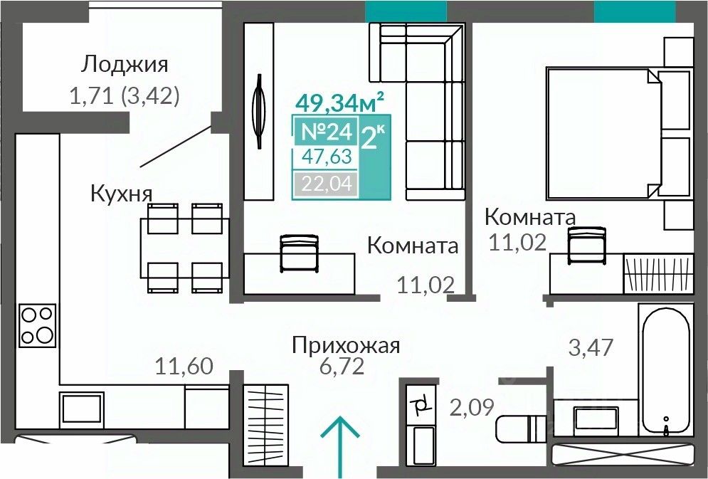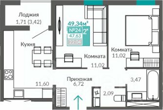 Общая площадь квартиры 49,34 кв.м.