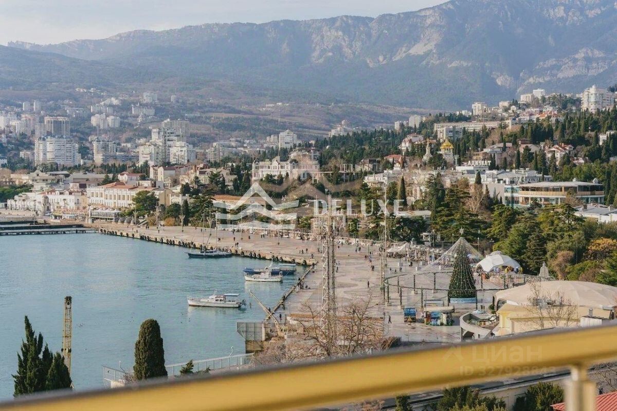 Просторная терраса с панорамным видом на море, горы, набережную Ялты и знаменитый отель "Интурист". Эти виды создают идеальную атмосферу для жизни и отдыха.