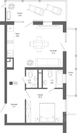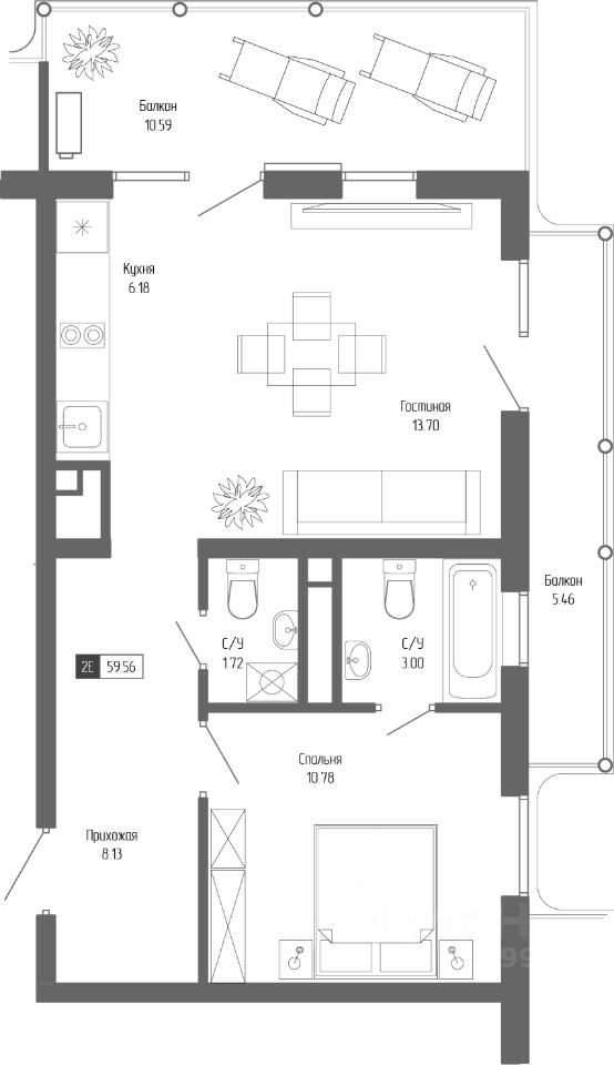 Общая площадь59,56 м²