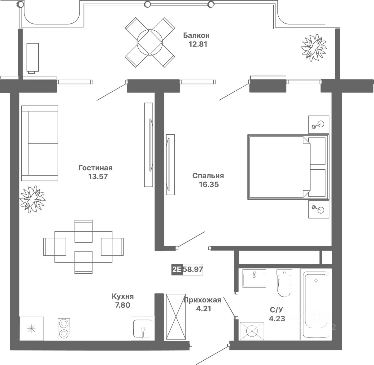 Общая площадь58,97 м²