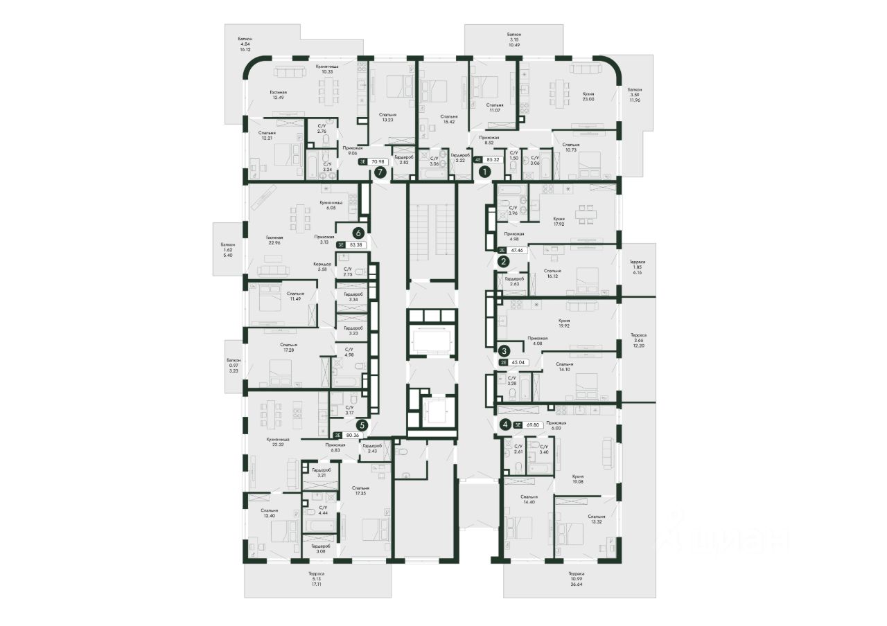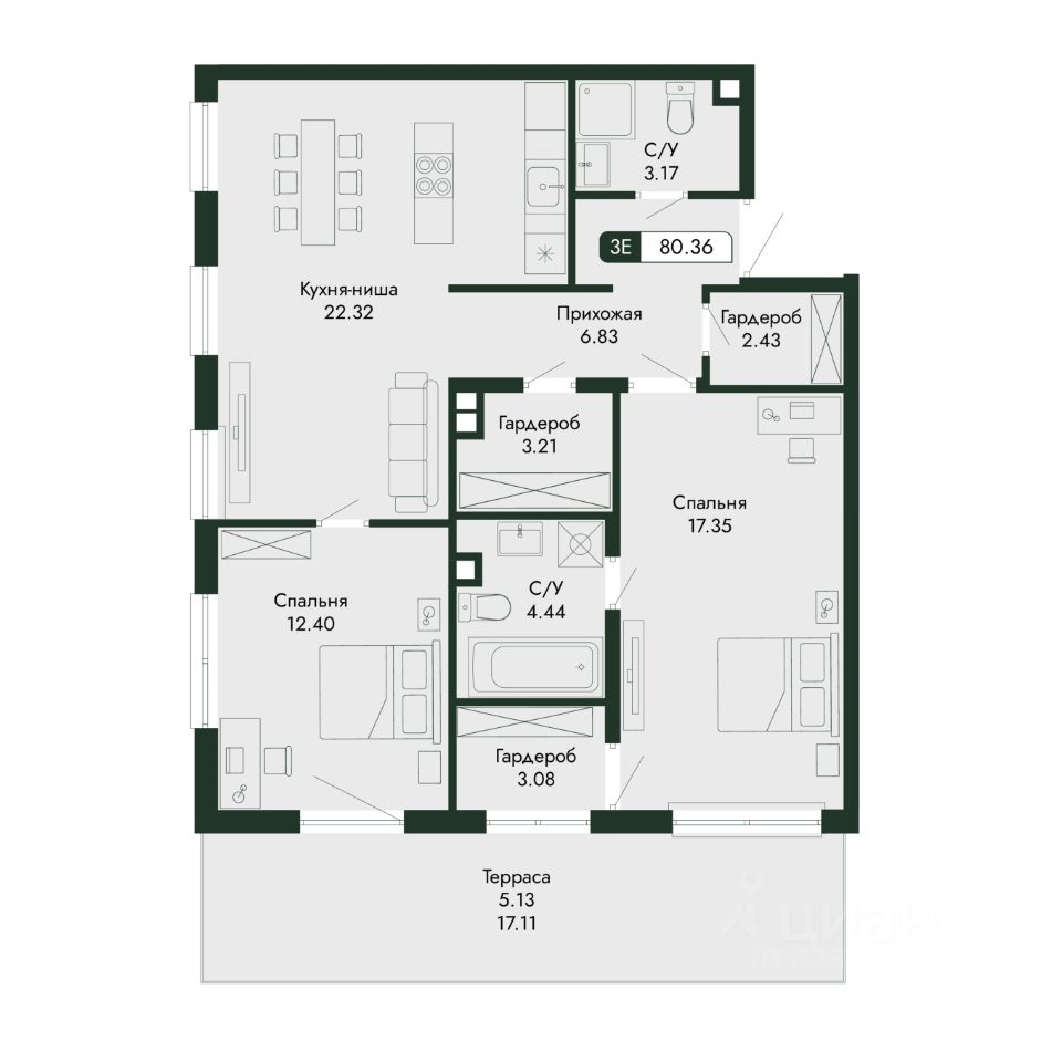 Продаётся 2-комнатная квартира в строящемся доме (дом 2), срок сдачи: III-кв. 2027, общей площадью 80.36 кв.м., на 2 этаже.