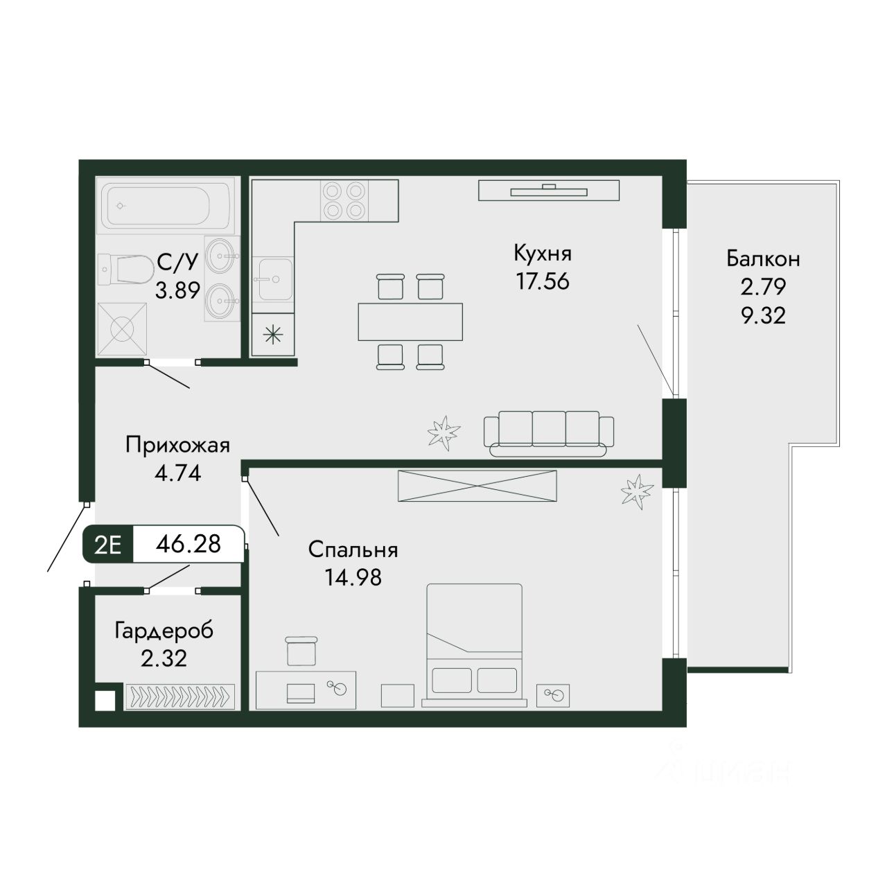 Продаётся 1-комнатная квартира в строящемся доме (дом 2), срок сдачи: III-кв. 2027, общей площадью 46.28 кв.м., на 3 этаже.