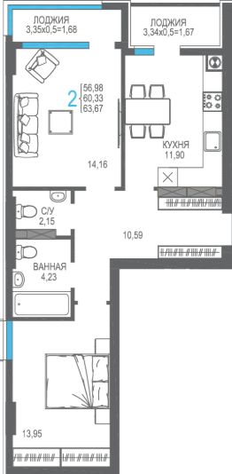 Продаётся 2-комнатная квартира в строящемся доме (Корпус 1), срок сдачи: I-кв. 2026, общей площадью 60.33 кв.м., на 8 этаже. Жилой комплекс "На Фонтанке" в городе Алушта на улице Багликова.