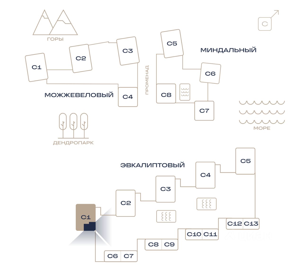 Жилые кварталы "Парковая Резиденция" — масштабный проект жилой застройки бизнес-класса на Южном берегу Крыма, в г. Алушта. Это концептуально новый стандарт комфортной жизни и отдыха на берегу моря, в окружении потрясающего парка. Место, которое расслабляет, успокаивает и вдохновляет. На территории площадью 5,5 га будут возведены 18 корпусов высотой от 7 до 14 этажей, отличающихся по своему архитектурному облику. Квартирография кварталов насчитывает более 160 уникальных планировок в форматах от студий до 5-евро, представленных в классах от "комфорт" до "премиум", включающих двухуровневые квартиры, пентхаусы. В проекте появятся квартиры с панорамным остеклением, видовыми балконами и открытыми террасами, мастер-спальнями, просторными гостиными и гардеробными. Будут доступны варианты с отделкой и без отделки. Территория застройки — вечнозеленый краснокнижный дендропарк с редкими и экзотическими реликтовыми деревьями, и растениями. Согласно проекту появятся три мини-квартала, названия которых привязаны к природе местности: "Можжевеловый", "Эвкалиптовый", "Миндальный". Прогуливаться будущие жители будут по дендропарку с редкими видами растений, отдыхать под гималайскими кедрами и вдыхать аромат кипарисовой рощи. Архитектура По авторскому замыслу московского проектного бюро BADR5 создан новый концепт, который станет украшением Алушты и будущей базой новой урбанистической культуры Крыма. Архитектура кварталов выполнена в стиле южного модернизма и органично вписывается в местный ландшафт. Переменная этажность секций и многообразие фасадных решений обеспечат эффектную и разнообразную городскую среду. Инфраструктура "Парковая Резиденция" — Идеальное место для тех, кто стремится к высокому уровню жизни и отдыха. Прогулочные зоны здесь отделены от спортивных площадок и детских игровых комплексов. Проектом предусмотрены закрытые благоустроенные дворы в окружении зелени, сеть извилистых дорожек, убегающих в разных направлениях, тайный сад для уединенного отдыха, площадки для занятий йогой и воркаута, своя роща. Для отдыха в кругу компании на территории появятся зоны барбекю со столиками и мангалами. Выделена территория для организованного выгула собак. Территория жилых кварталов богата собственной инфраструктурой. На территории появятся крытые и открытые бассейны (в том числе бассейн-инфинити). Вблизи от аквазон появятся бары и зоны шезлонгов в тени зонтов и деревьев для комфортного отдыха у воды. Жители кварталов смогут ежедневно делать выбор: отдохнуть у бассейна на территории или пройтись до пляжа, который находится в пешей доступности от "Парковой Резиденции". Точкой притяжения для жителей и гостей жилых кварталов станет торговый бульвар, на котором появятся кафе, ресторан, винотека, мини-маркет, аптека, салон красоты, пекарня, химчистка, образовательный центр и многое другое. Для удобства жителей кварталов на территории будут обустроены наземные парковки, а в стилобате между корпусами появится подземный паркинг и келлеры для хранения вещей.