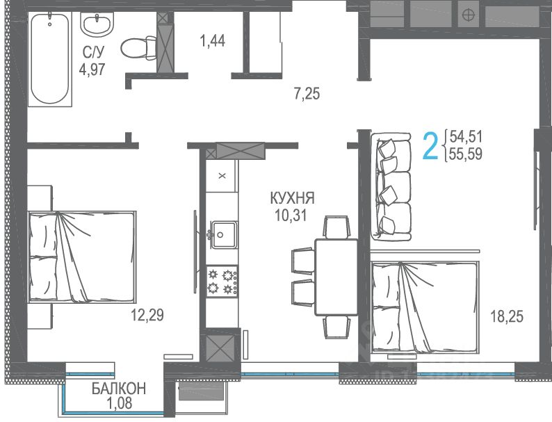 Продаётся 2-комнатная квартира в строящемся доме (Дом 2), срок сдачи: III-кв. 2026, общей площадью 55.83 кв.м., на 6 этаже. Жилой комплекс от застройщика "Интерстрой" в п.г.т. Гвардейское Симферопольского района на улице Курганная.