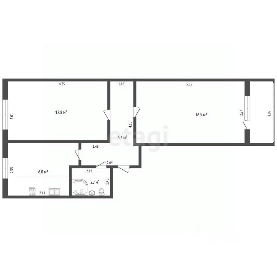 Квартира отличается продуманной планировкой с двумя изолированными комнатами 16.5 и12.8 м²
