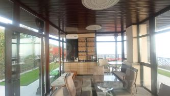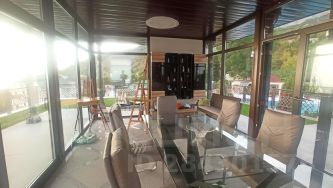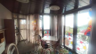 - 3-й этаж: терраса с крытой беседкой (заслуживает отдельного внимания!), сделанной полностью из панорамных окон, чтобы можно любоваться шикарными видами на все стороны! В беседке имеется барная зона, мягкая мебель. На открытых участках террасы имеется газон с травой.