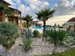 Также на территории комплекса имеется зона отдыха с мангальной печью-барбекю, ротондой, в которой стол выполнен из натурального мрамора с вращающейся столешницей. В данной зоне также имеется раздельные туалет и душевая комната.