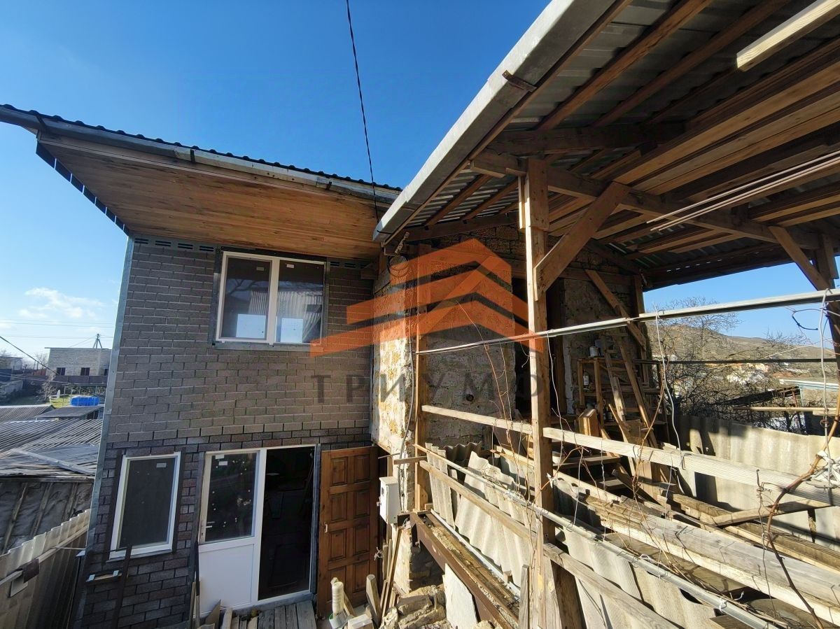 Дом в настоящее время реконструируется, готовность 80%, на первом этаже Г-образная комната площадью 39 м2, кухня - 10 м2, на втором этаже: Г-образная комната площадью 39 м2, и комната 20 м2, есть чердак и подвал, у входа - навес-оранжерея, рядом высажен виноград. В доме санузел и раковина, коммуникации заведены, установлена бочка для воды возле дома. По кадастру дом 53,5м2, как до реконструкции, обшит мягкой черепицей, внутри до половины стены обшиты ламинатной доской, везде дерево.