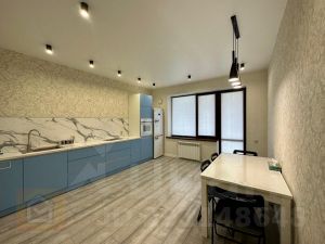 Кухня со встроенной качественной мебелью в "небесно-голубом" цвете, из кухни есть выход на террасу с теневым навесом.