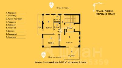 Первый этаж представляет собой уникальное пространство, включающее просторную кухню-гостиную с выходом на обширную террасу, открывающую захватывающий вид на море, кабинет для работы или творчества, спальню с балконом и гардеробной комнатой, а также удобный санузел.