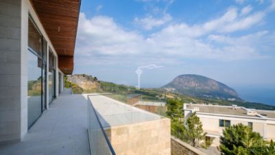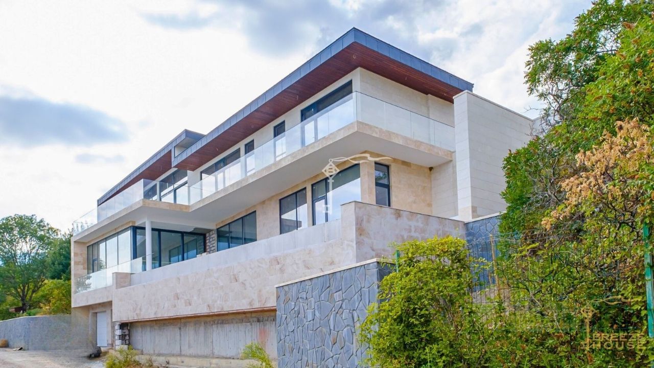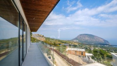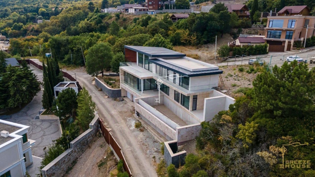 Продажа стильного минималистичного дома с панорамным остеклением и просторными террасами с видом на море и горы, расположенного на участке 10,5 соток с бассейном в живописном поселке Краснокаменка вблизи Гурзуфа.