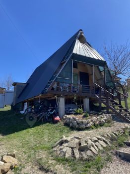 На территории расположен треугольный ,каркасный дом 70кВ метров, в доме имеется на 1 этаже - 2 комнаты , кухня и ванна с с/у , на втором этаже одна комната.