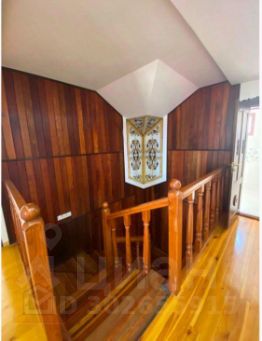 Лестничная клетка изготовлена из металлического каркаса обшитого красным деревом, как и стены лестничной шахты, перила изготовлены из натурального дерева.