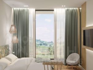 НА ВТОРОМ ЭТАЖЕ находятся мастер-спальня (13 кв.м.) и детская комната (13 кв.м.). Пол в комнатах выполнен из прочной инженерной доски из натурального дерева. Мастер-спальня имеет панорамное окно с выходом на уютную террасу (4,51 кв.м.), в комнате установлена большая двуспальная кровать с мягким изголовьем. В детской комнате установлены две односпальных кровати с мягким изголовьем.