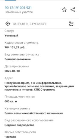 Продам садовый участок р-н Симферопольский, Урожайновское сельское поселение, за границами населенных пунктов, СПК Строитель