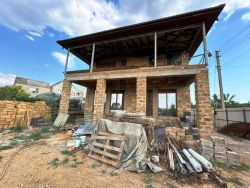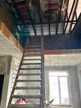 На втором этаже стены не оштукатурены, необходимо вставить два панорамных окна. Лестница на второй этаж планируется в доме с кухни-гостиной.
