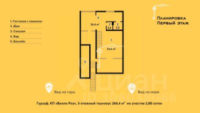 Первый этаж: при входе вас встретит гостиная с подвесным стеклянным камином с выходом на видовую террасу с бассейном, далее бар с выходом на зеленый задний дворик, санузел и душеая.