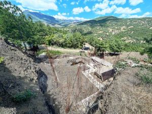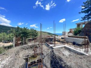 На участке проведены работы согласно проекта. Залита лента фундамента дома и фундамент и стены гаража.