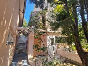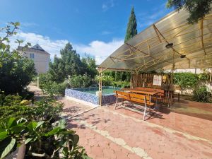 На территории имеется небольшой бассейн и хозяйственная постройка, которая выполняет функцию летней кухни и столовой, на втором этаже расположены три спальные комнаты для гостей или сотрудников гостевого дома.