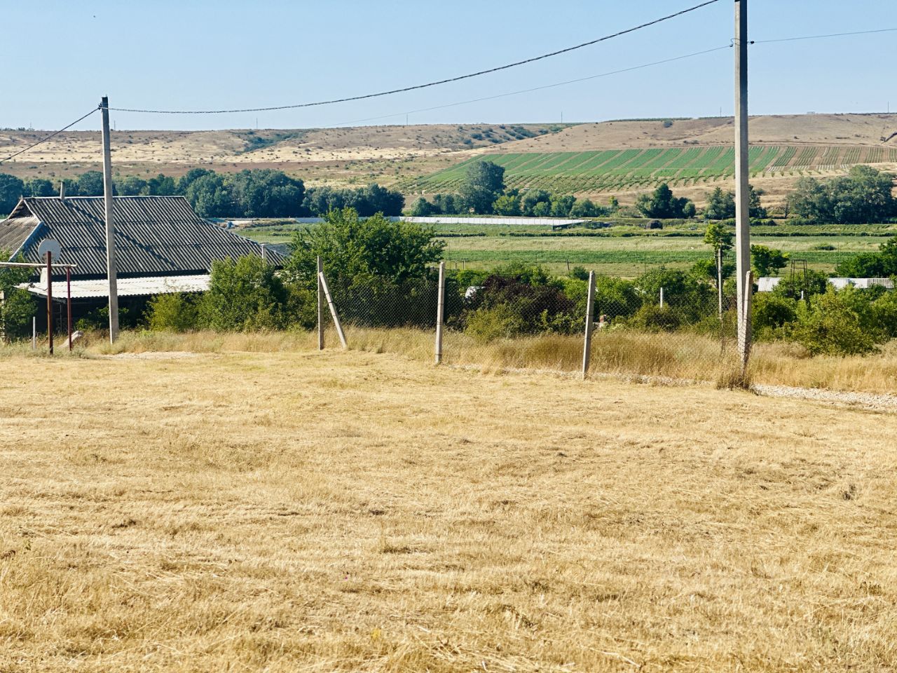 Коммуникации: свет, газ, вода вдоль границы участка. Участок частично огорожен сеткой рабицей.