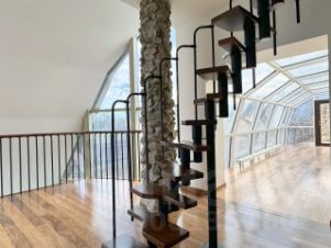 Первый этаж дома состоит из прихожей, большого зала-гостиной с панорамным остеклением, санузел, кухня-толовая, спальня, кинозал. На втором этаже уютно расположились мастер спальня с гардеробной и санузлом, две раздельных спальни с общим санузлом, выход на балкон. На мансардном этаже расположен кабинет.