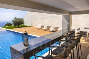 На территории виллы расположен большой плавательный бассейн с зоной релакса, зона барбекю с беседкой, чайный домик, гараж с эксплуатируемой кровлей, предусмотрены технические помещения и комнаты для проживания персонала.